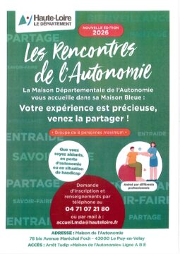 Dans le cadre de nos actions en faveur de l’autonomie des personnes âgées (PA), des personnes handicapées (PH) et de leurs aidants, la Maison Départementale de l’Autonomie (MDA) proposera à nouveau en 2026 « Les Rencontres de l’Autonomie », des ateliers participatifs et adaptés aux besoins des usagers.